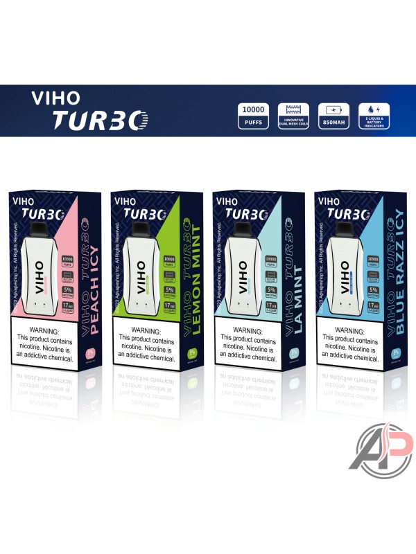 Introducing The-All New VIHO Turbo 10000 Puff disposable vape, The biggest one yet, featuring all the new tech you will need. The VIHO Turbo 10000 is one of the first smart and big disposables loaded with innovative features such as the smart light Indicator that will take the hassle of guessing and determining how much juice is left in the built in 18mL tank, preventing those harsh burnt hits! The innovative Battery light indicator will let you know your battery status and when you need to give it a recharge. The VIHO Turbo features new Duel boost Nexcore Mesh Coil technology that will make it much more longer lasting and a better tasting experience then most other brands, you won’t be disappointed. All powered by a massive 850mAh rechargeable battery and Pre-filled with 18mL of 5%/50mg Salt Nicotine. Integrating all these new awesome features, allows you the user to have a hassle-free vaping experience. Available in 12+ Flavors. Be The first: To try the VIHO Turbo only at Apvapeshop.com